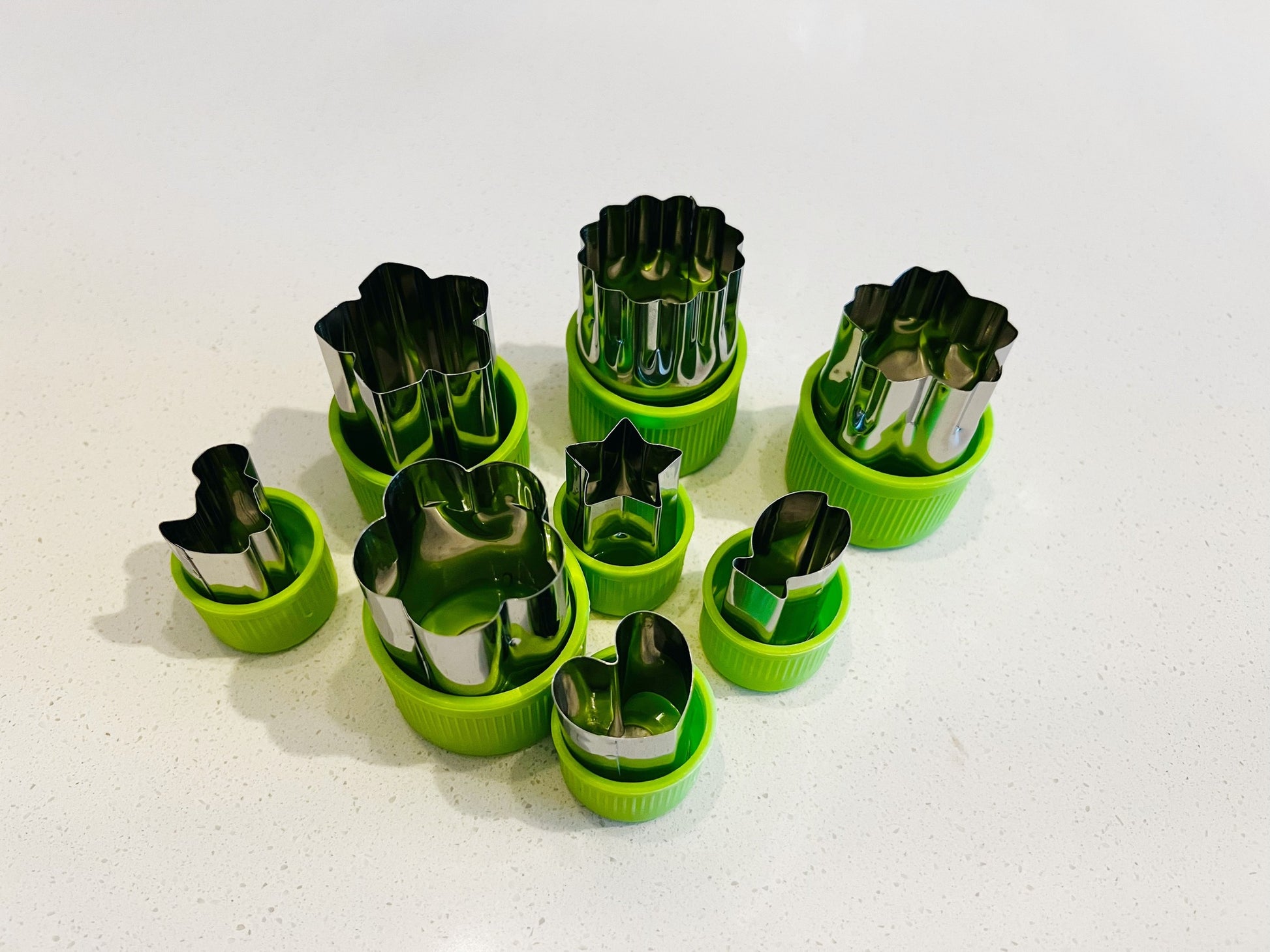 - 8 cortadores pequeños con diseños variados para frutas y vegetales.